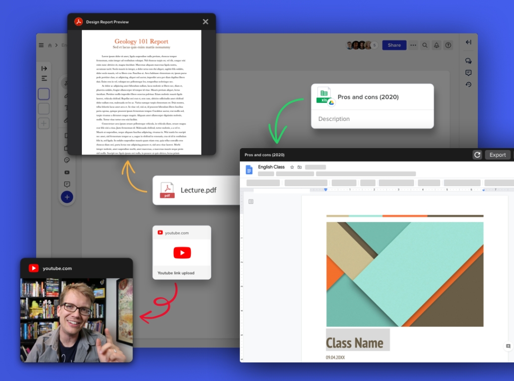 マルチコンテキストの添付前述したように、Sami氏は授業中にビデオや画像を参照として加えることを好んでいます。Alloを使用すると、YouTubeのビデオ、画像、およびPDF, Google Docs, Photoshopなどの他の多くの種類のファイルをキャンバスにドラッグアンドドロップするだけで簡単に作成できます。ファイルはAllo内で直接プレビューできるだけでなく、GoogleドキュメントもAllo内でリアルタイムの編集と更新ができます。