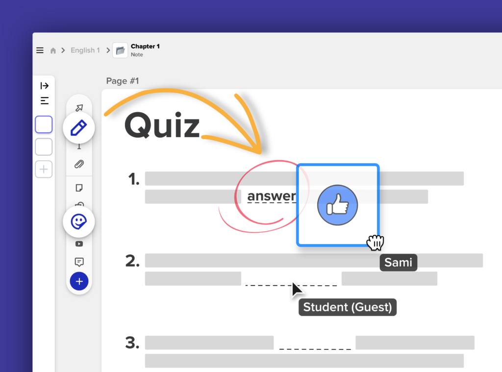 Sami氏と生徒たちは、キャンバス上で同時にコラボレーションすることができます。生徒たちがクイズの答えを記入している間、Sami氏はペンツールを使って間違った答えに〇をつけたり、ステッカー、図形、付箋を使ってメモを作成したりすることができます。